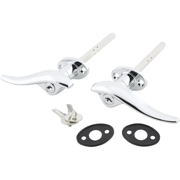 One pair of die-cast chrome plated exterior locking door handles. Both handles have lock cylinders. Fits 1932 3 window Ford coupes and 1933-34 passenger cars. Comes with 2 keys.